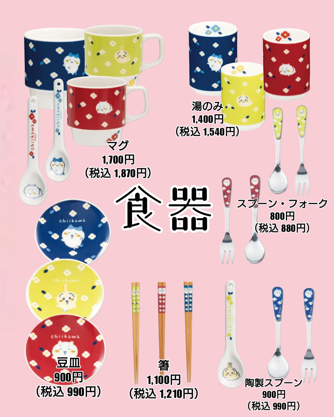 ラインナップ:湯呑み、豆皿、箸、カトラリーセットなど。